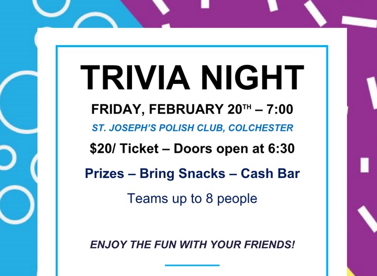 Come enjoy an evening of Trivia sponsored by the Colchester Democratic Town Committee on Friday, February 20, 2026, at The Colchester Polish Club. There will be prizes. Bring your own snacks and plan to purchase drinks at the cash bar. Tickets are $20.00 per person for tables of up to 8 people. Doors open at 6:30pm in time for a 7pm start. Purchasing tickets in advance at https://secure.anedot.com/colchesterdemocrats/donate is highly encouraged as seating is limited. Tickets will also be sold at the door. Everyone is welcome to join, no matter the size of your group. Hope to see you there!